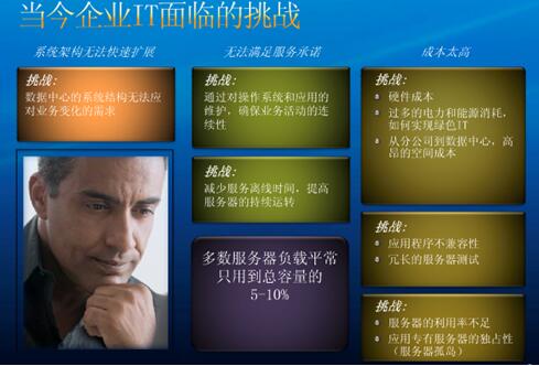 雖然大(dà)多數服務器(qì)系統資源的(de)利用(yòng)率在10%-15%,但(dàn)是構架,安全和(hé)兼容性方面的(de)問題導緻必須指定不同的(de)物(wù)理(lǐ)平台來運行(xíng)它們。管理(lǐ),安裝補丁和(hé)添加安全策略将花去大(dà)量的(de)時間。另外,服務器(qì)的(de)衍生組件(jiàn)将導緻設備,動力和(hé)散熱(rè)方面的(de)成本上(shàng)升。