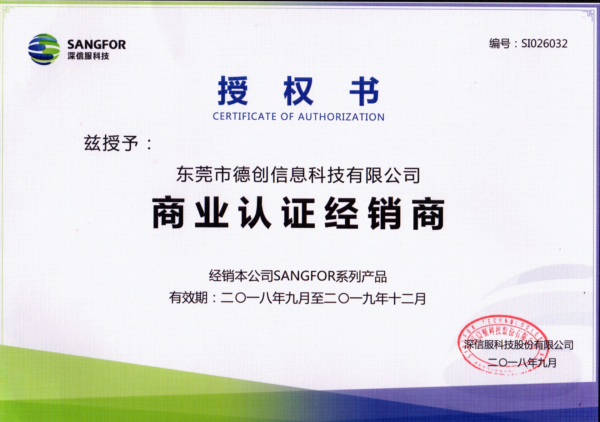 喜訊!德創科技榮獲深信服科技2018年-2019年商業(yè)認證經銷商證書(shū)!