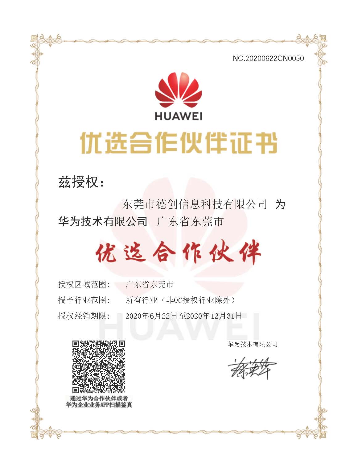 喜訊!東莞德創喜獲華爲東莞區域地(dì)級優選合作夥伴證書(shū)