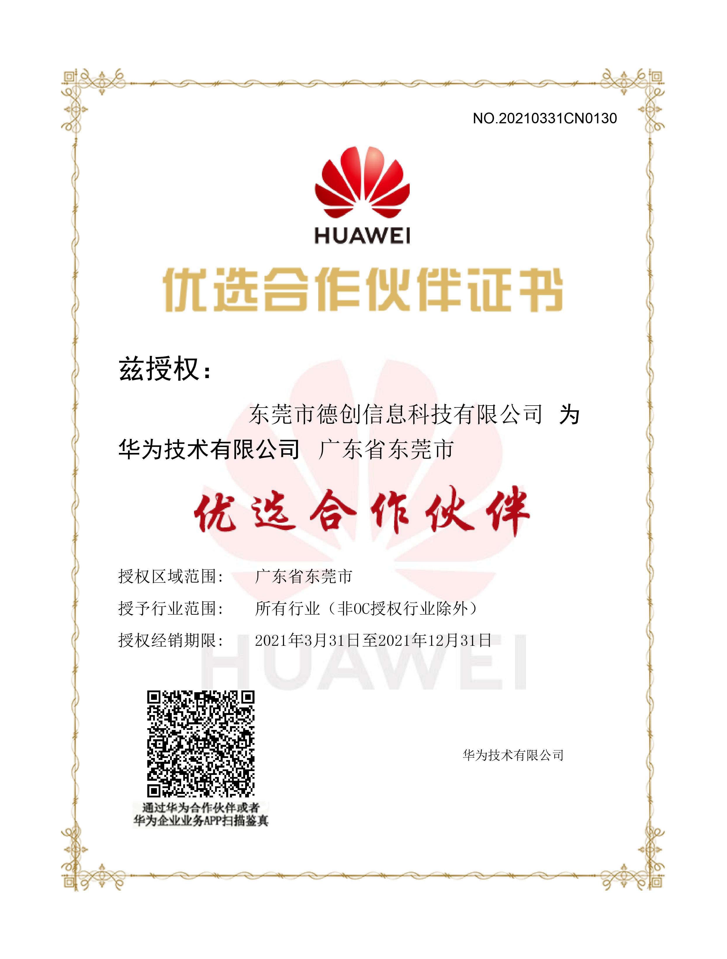 喜訊!德創科技榮獲華爲2021優選合作夥伴證書(shū)