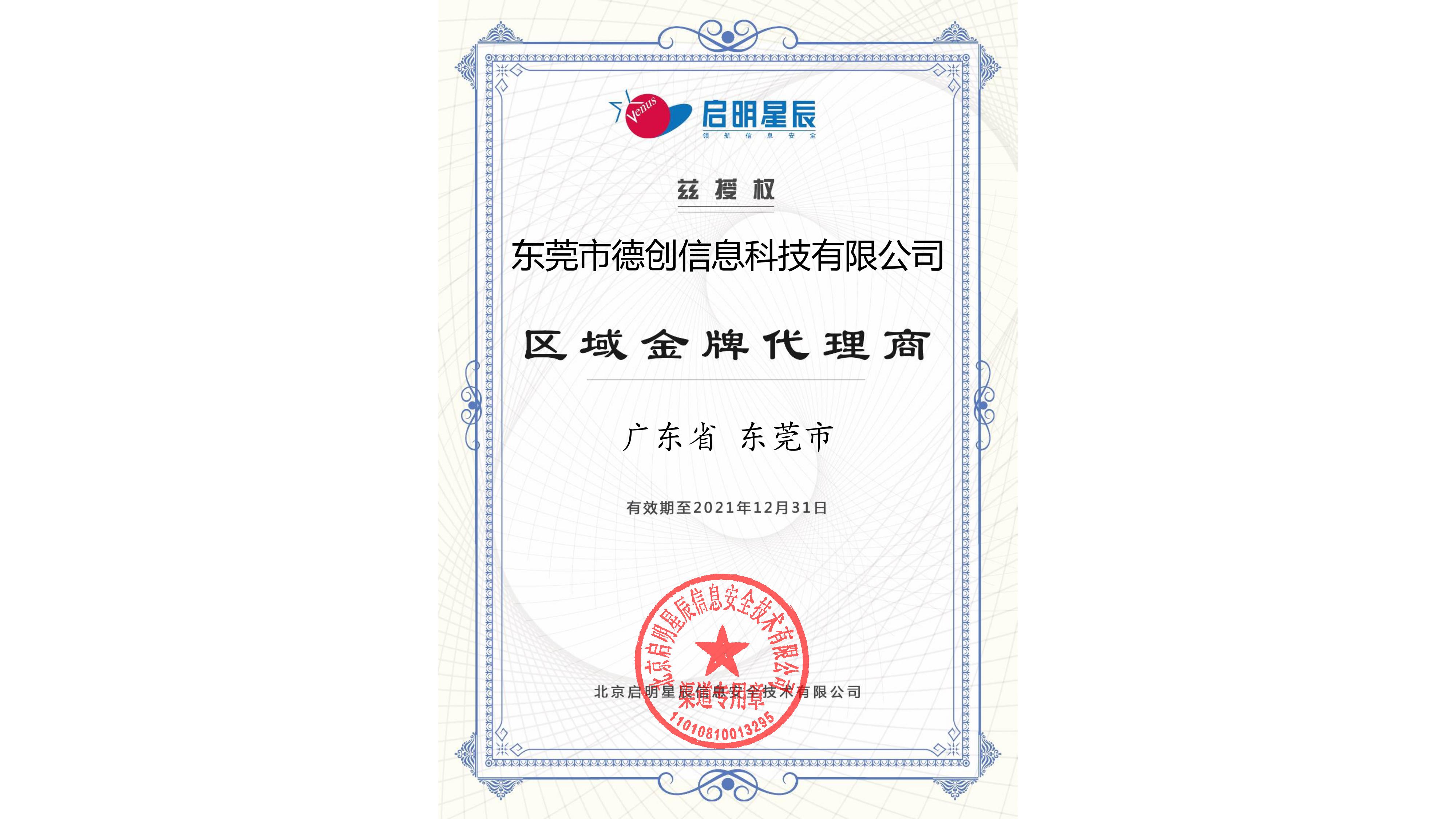 喜訊!德創科技榮獲啓明(míng)星辰2021金(jīn)牌代理(lǐ)證書(shū)