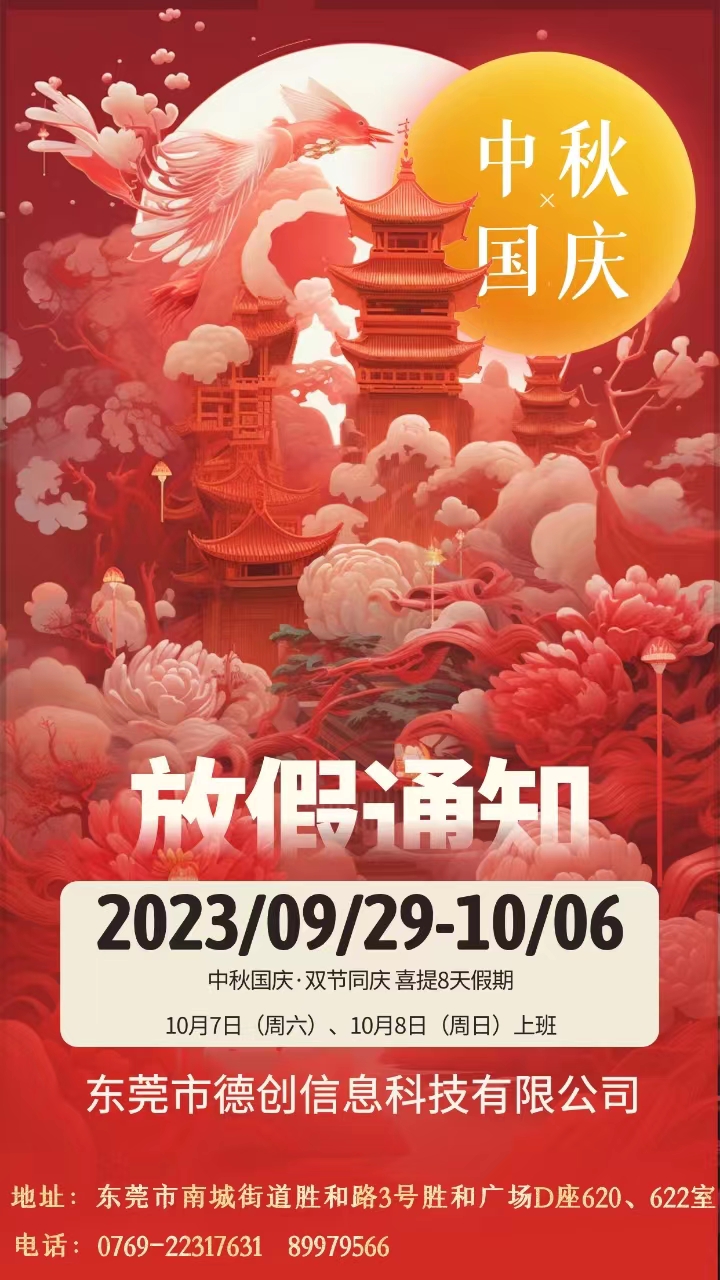 現将2023年中秋節及國慶放(fàng)假安排通知如(rú)下:9月(yuè)29日(星期五)至10月(yuè)6日(星期五)放(fàng)假,共8天;2023年10月(yuè)7日 (周六)正常上(shàng)班;放(fàng)假期間,如(rú)有(yǒu)技術(shù)問題我司可(kě)提供電話(huà)或遠程技術(shù)支持,特殊情況可(kě)提供上(shàng)門技術(shù)支持;度過一個(gè)歡樂(yuè)、祥和(hé)的(de)節日假期