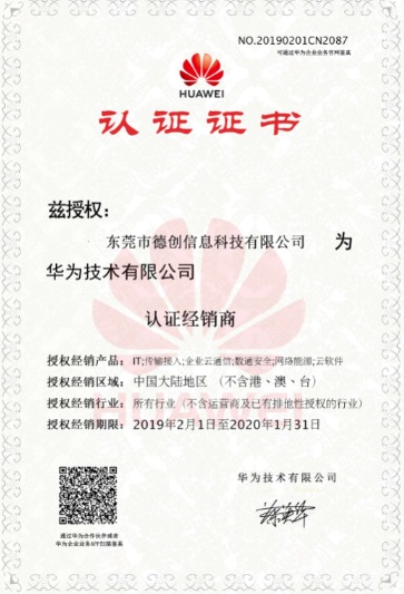 喜訊!德創科技榮獲華爲2019年認證證書(shū)