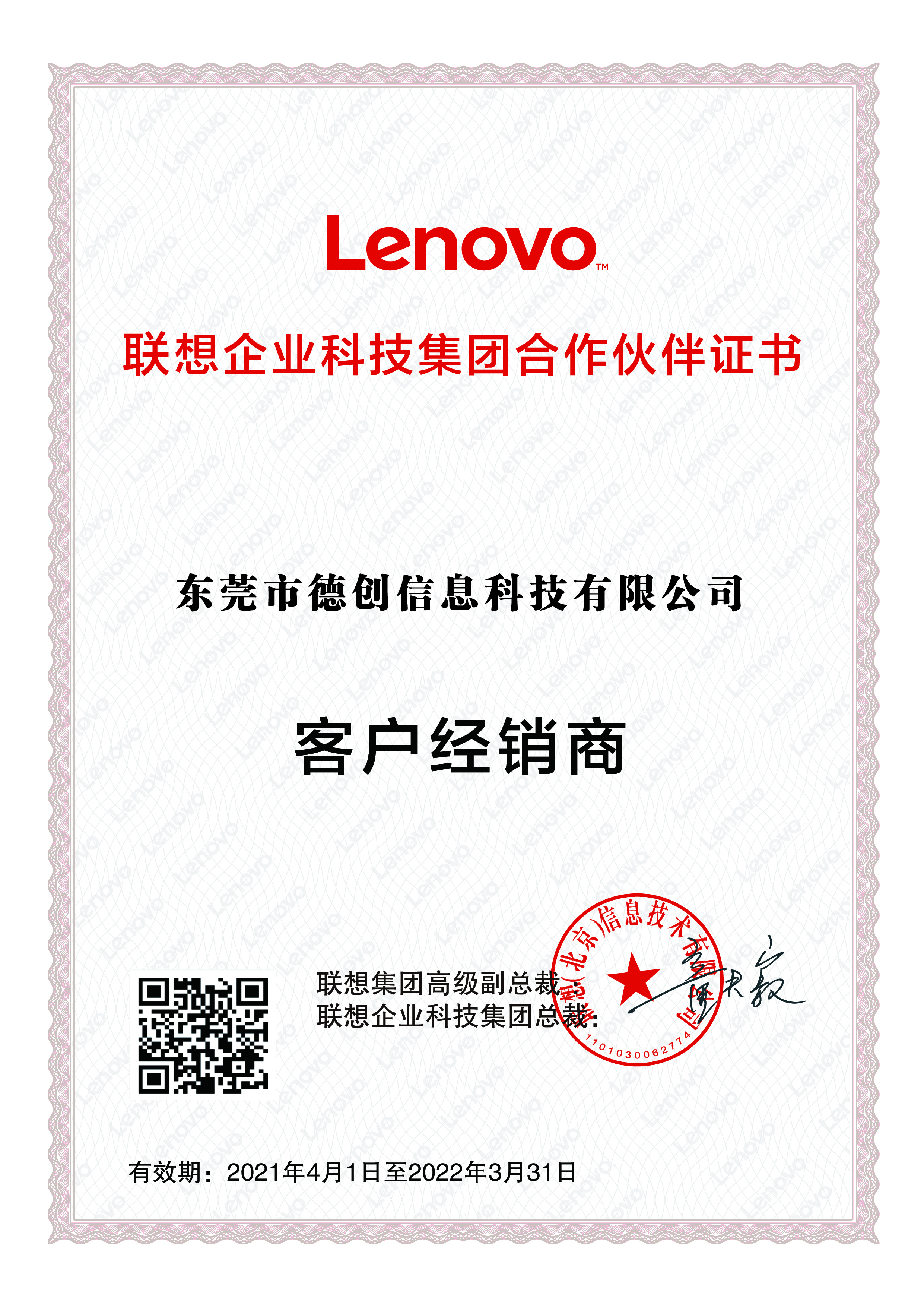 喜訊!德創科技榮獲聯想2021年認證證書(shū)